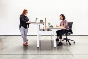 The evolution of the new work space has seen two big moves: 1. The hybrid workplace strategy allowing for flexibility between two work surfaces (either your own personal desk space or a gathering of ancillary furniture often including a formula of lounge chairs, coffee tables, and occasional tables), and 2. The sit/stand strategy allowing for versatility and promoting a healthier, active work/life style. As a response, Gensler and MASHstudios worked with Zendesk to introduce a workstation system for the company’s newest office location in Madison, WI.